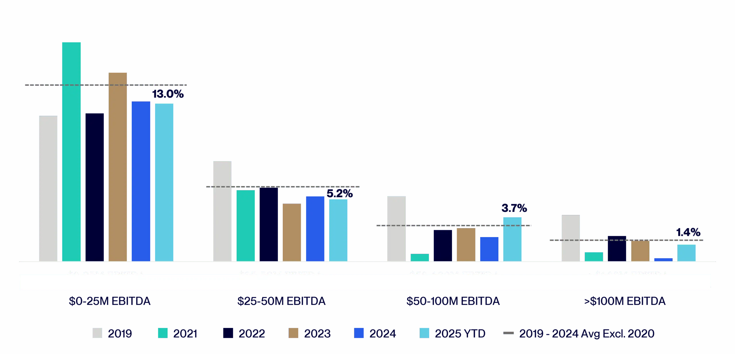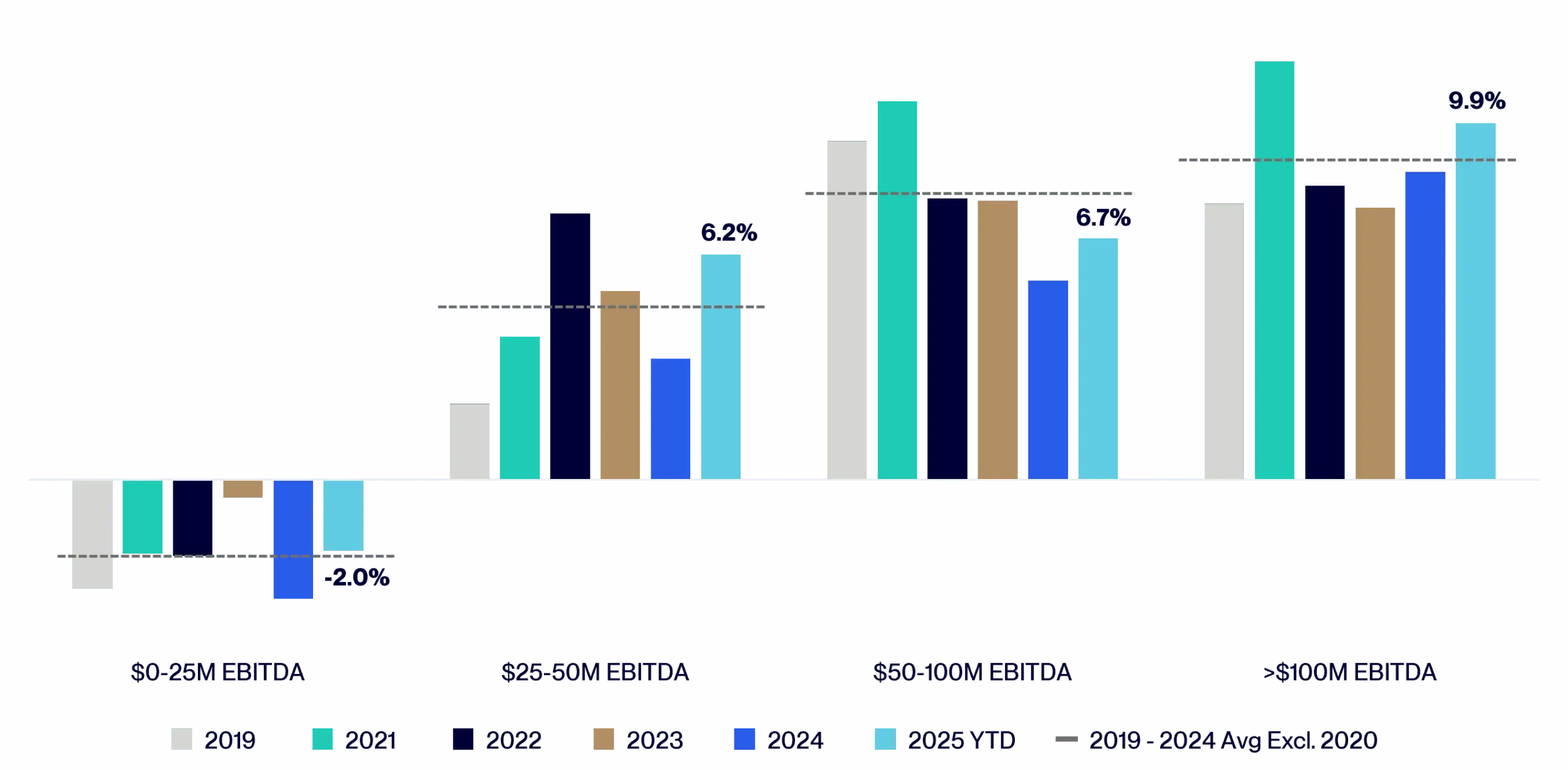 Growth is strongest in the upper middle market – companies with $100 million plus of EBITDA – which are posting last twelve months EBITDA growth just under 10%. As shown in the chart at the top of the next page, this is well above their average from 2019 to 2024, excluding 2020 due to the distortive impact of the COVID-19 pandemic. The core middle market – companies with $50 to $100 million of EBITDA – exhibited trailing 12-month EBITDA growth of 6.7% over the same period, demonstrating some resilience even amid a more challenging operating environment.3