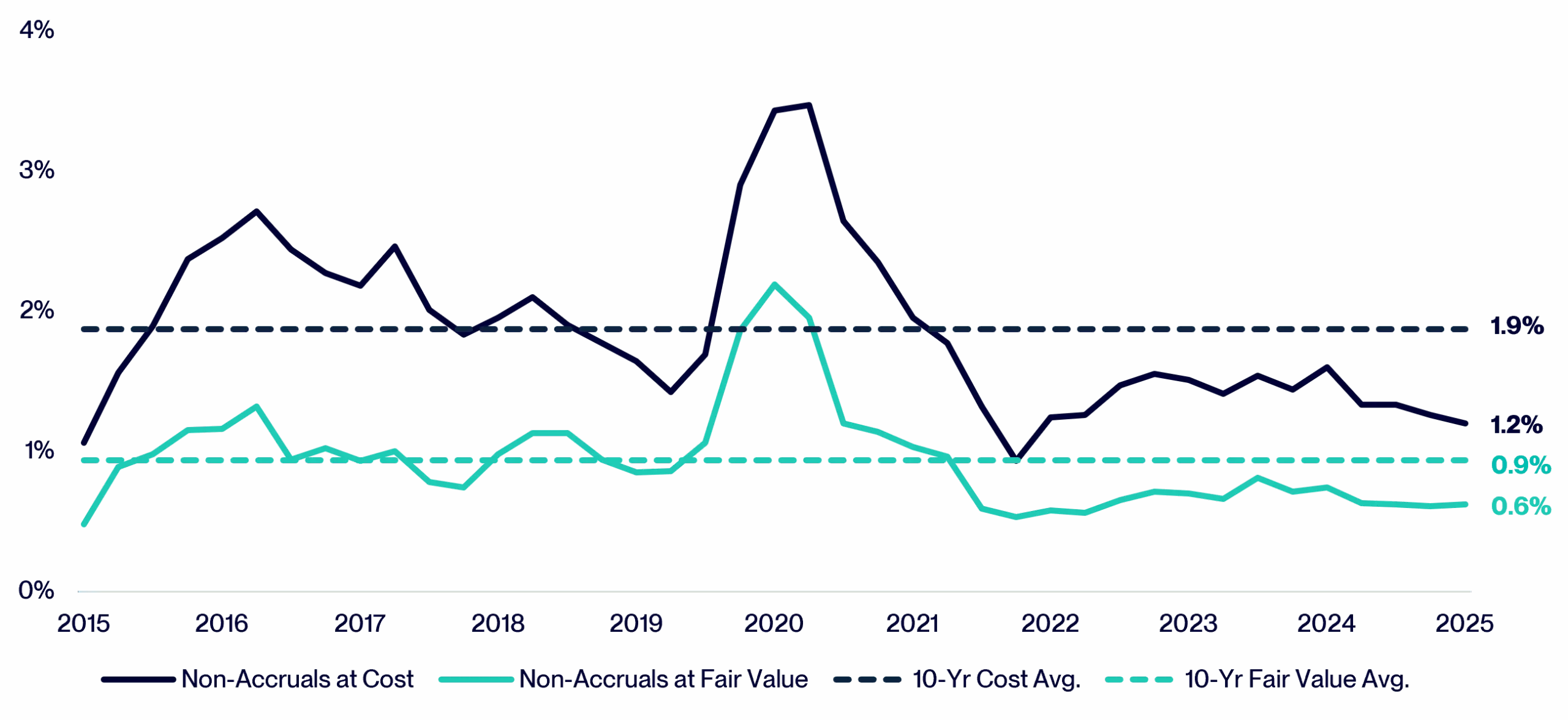 Based on Cliffwater’s data, which tracks nearly 20,000 loans across publicly traded, non-traded and private BDC portfolios, broader portfolio credit performance appears to be generally consistent with or in some cases, better than historical norms. Non-accrual rates, on both a cost and fair-value basis, remain comfortably under the respective 10-year averages and are not upward trending, suggesting credit performance has remained stable.