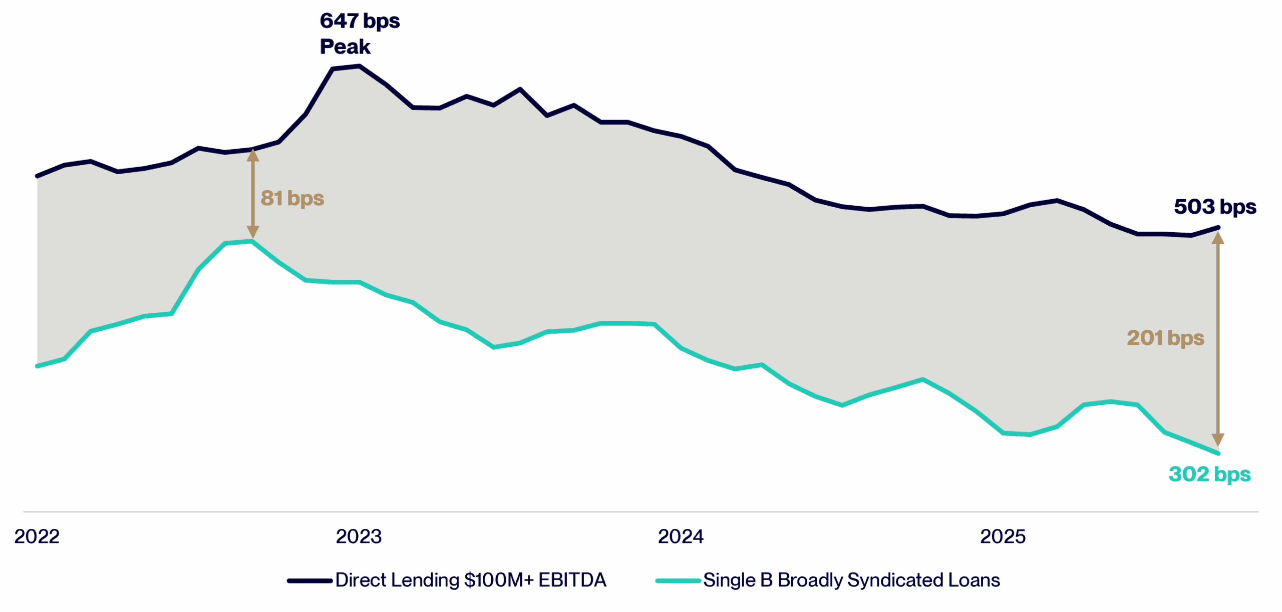 While interest rates have moved lower – with the Federal Reserve cutting five times since September 2024 – and direct lending spreads have compressed from the elevated levels of late 2023, we continue to view all-in private credit returns as attractive. We believe that it is appropriate to evaluate private credit on a relative-value basis, not in isolation. Today, direct lending is offering more than 200 basis points of excess spread return relative to new-issue single-B broadly syndicated loans, the closest comparable public-market floating rate asset class.6 This relative return potential sits at the wider end of the range dating back to 2022, underscoring that relative value remains favorable even as rates and spreads normalize. In short, despite falling base rates and tighter spreads, we feel that the premium investors receive for private credit exposure has remained robust.